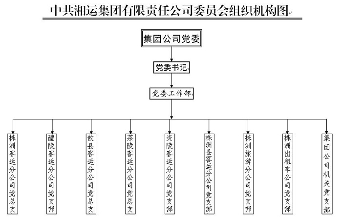 中共湘運集團有限責任公司委員會,隸屬于中共株洲市非公有制經(jīng)濟組織工委。黨委會常設(shè)工作機構(gòu)黨委工作部。全司共有中共黨員304名。下轄株洲客運分公司黨總支、醴陵客運分公司黨支部、攸縣客運分公司黨總支、茶陵客運分公司黨總支、炎陵客運分公司黨支部、株洲縣客運分公司黨支部、株洲旅游分公司黨支部、株洲出租車公司黨支部、集團公司機關(guān)黨支部共9個二級基層黨組織。